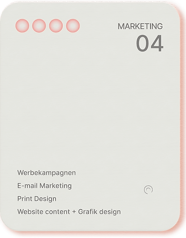 Marketing: Erstellung von Werbematerialien, Website-Content, Print-Design, Social-Media-Kampagnen und E-Mail-Marketing.